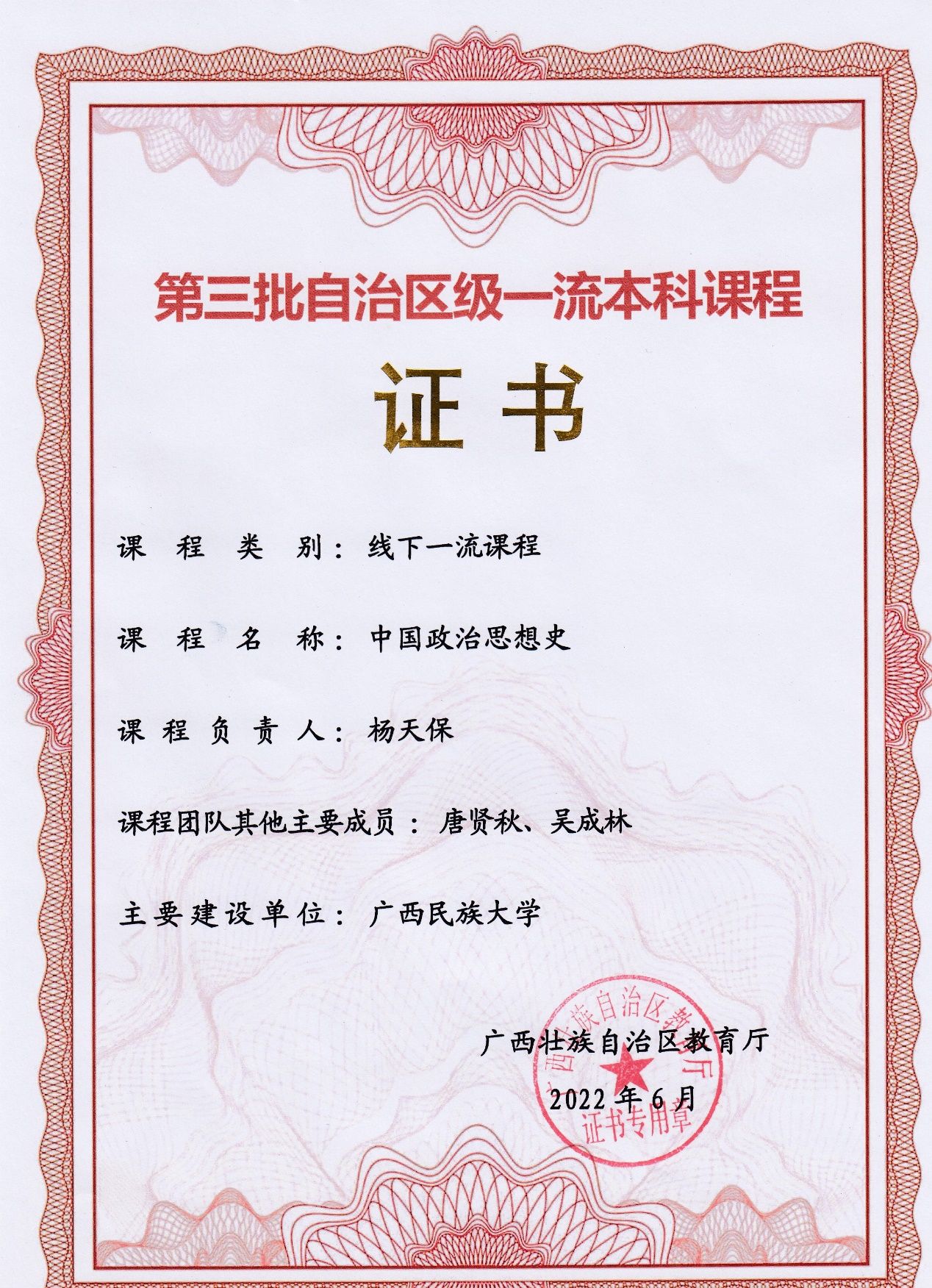 2022年6月,我院《中国政治思想史》课程荣获第三批自治区级一流本科课程(线下)。该课程团队由杨天保教授、唐贤秋教授和吴成林副教授组成。《中国政治思想史》是政治学与行政学本科专业必修课程,一方面,它梳理中华民族五千年政治文明史的思想脉络,揭示中国政治思想史的发展规律,思想性强;另一方面,传统学问丰富,是治理国家、处理政治关系及促进政治发展的中国理论与中国方案的大汇聚。
