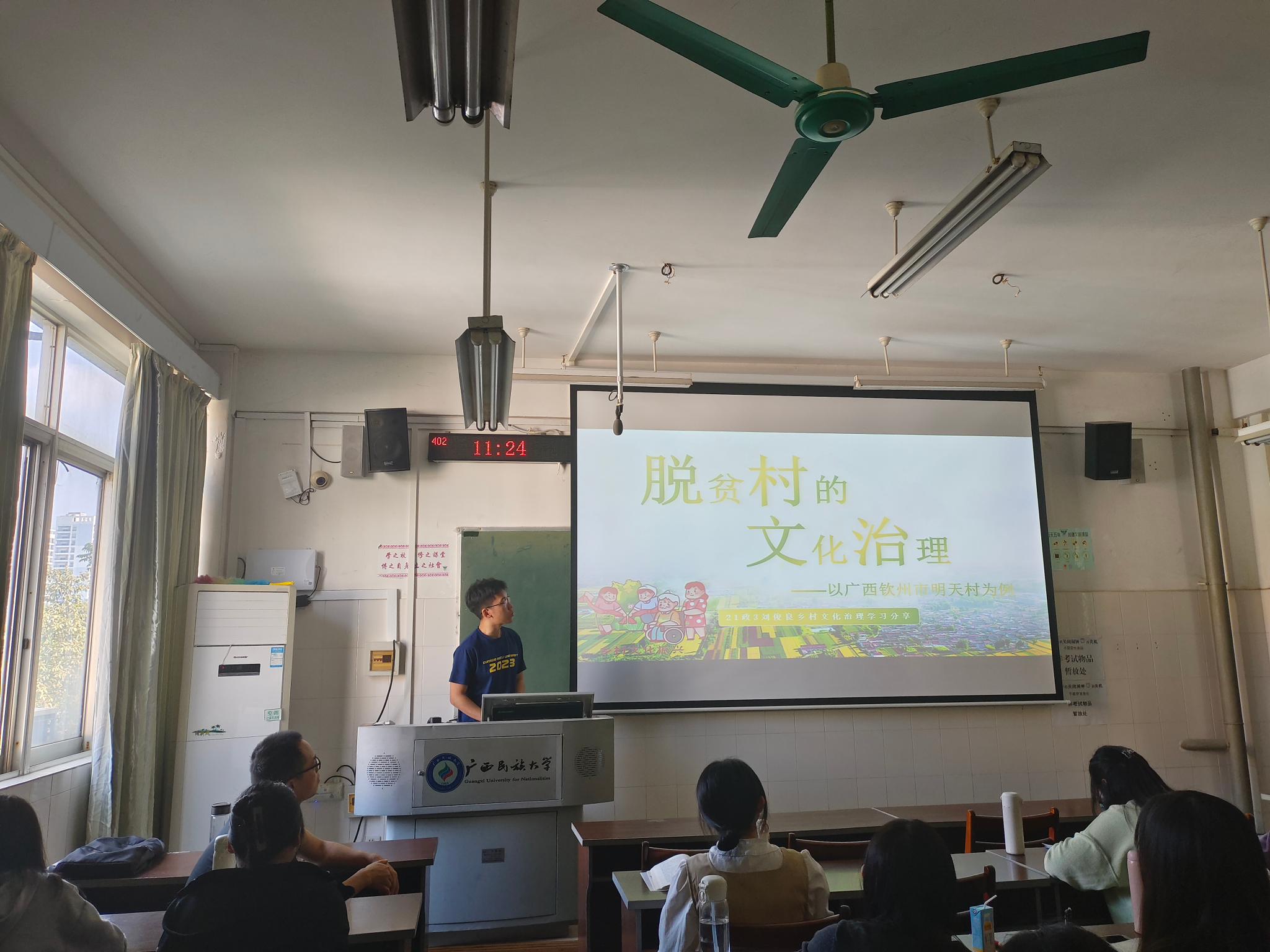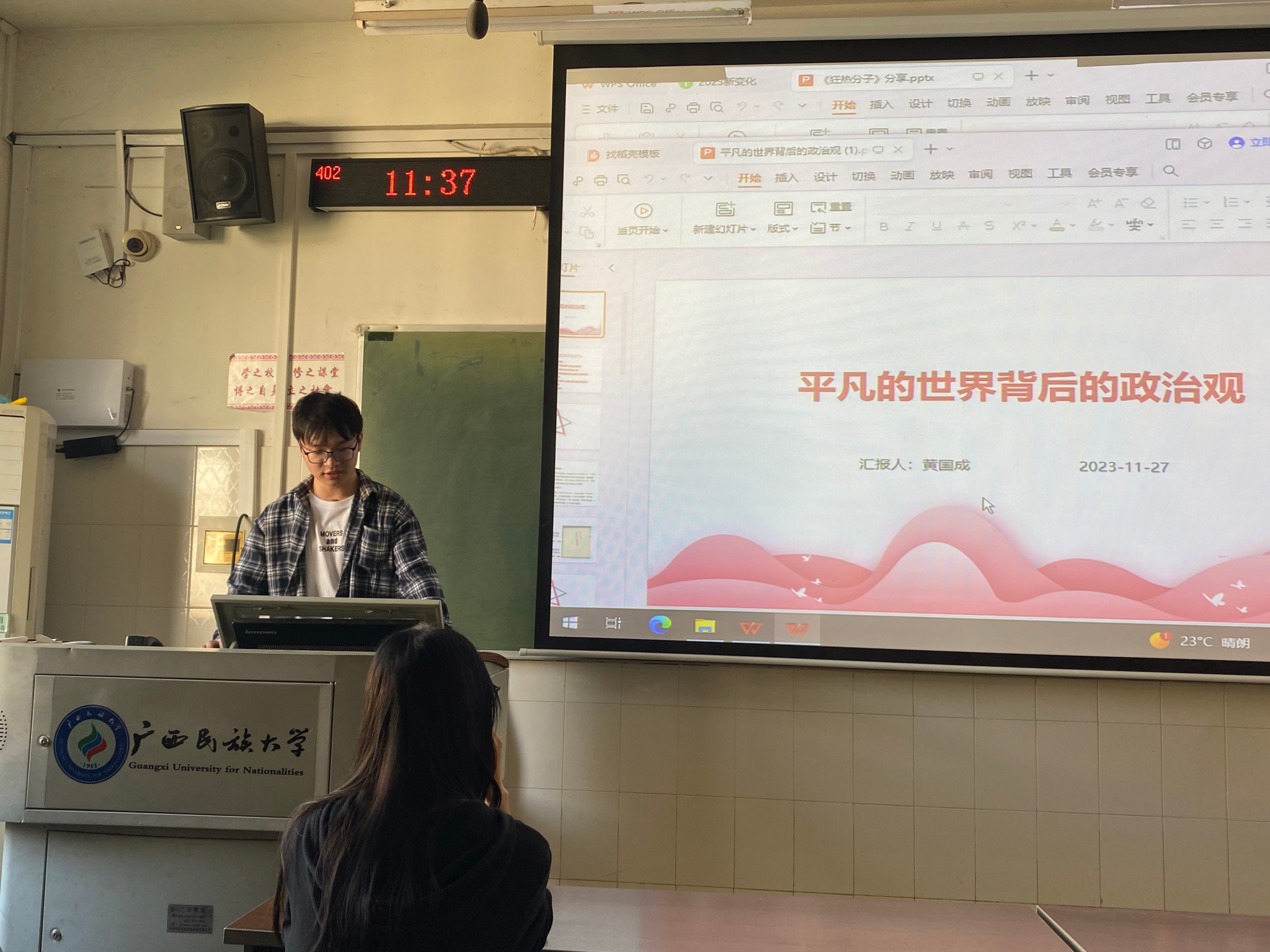 黄秋丽、吴彦琦、刘俊良、韦昌波同学围绕自己的暑期社会实践调研活动展开分享,根据自己在调研实践中的所见所闻、所感所想对田野调查方法提出自己的独到的见解。邱盛鑽、黄国成、黄鑫煜同学分别就《菊与刀》、《平凡的世界》、《狂热分子》进行读书心得分享,三位分享者结合自己的实践经历,感悟书中所讲述的内容。陶秀琪、韦贞宇、邓水莲同学则结合专业知识,围绕政治制度展开分享。邓水莲同学以思维导图的形式,简洁明了展示了宰相制度演变的过程,针对某些同学们感兴趣的案例进行了分享。周文超同学则从政治现象分享自己对机制、体制以及制度三者的联系和区别的理解。
