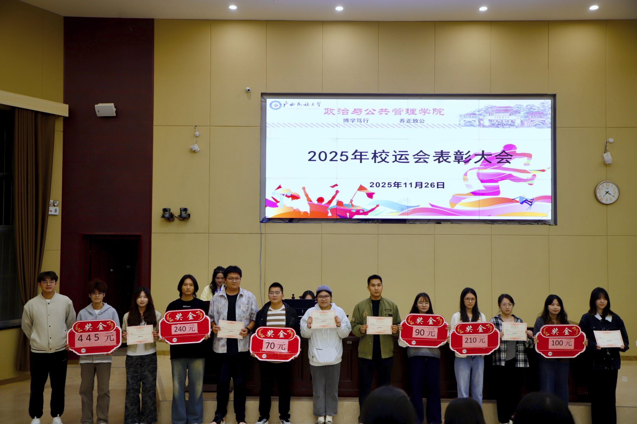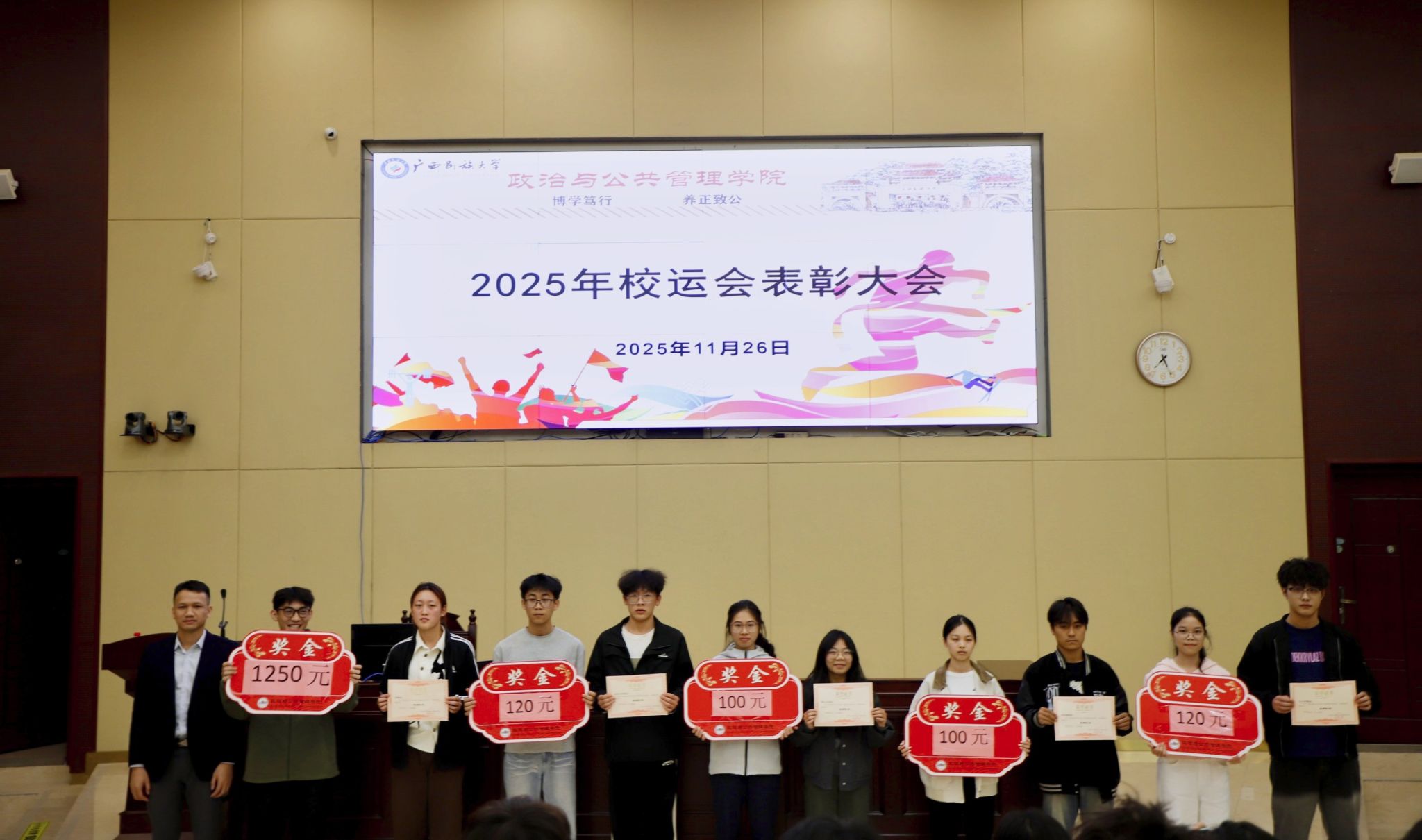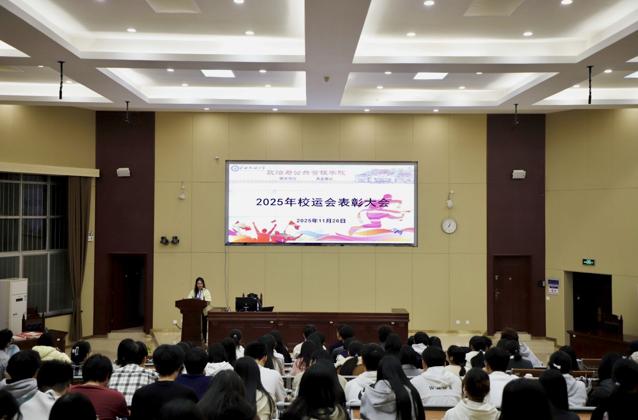 11月26日晚,我院于创新楼报告厅召开2025年校运会表彰大会。学院党委副书记覃国化,辅导员陈曦以及全体运动员、工作人员代表共同参会。