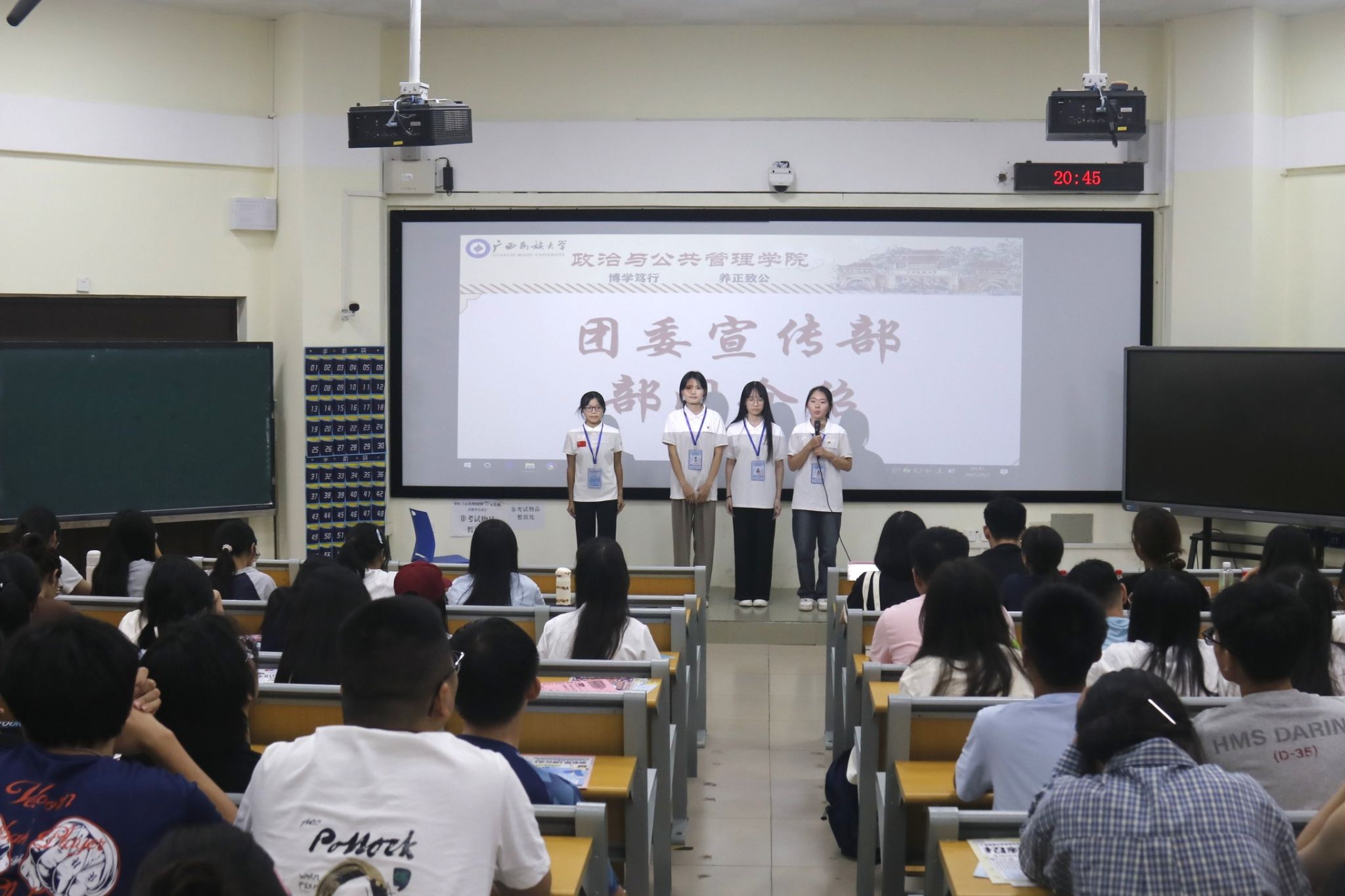 9月7日晚,政治与公共管理学院分别于学友楼101室、102室召开政治系、公管系“传承启新”交流会暨学生组织介绍会。团委书记农植媚,辅导员王妃、鞠润康参加此次会议。