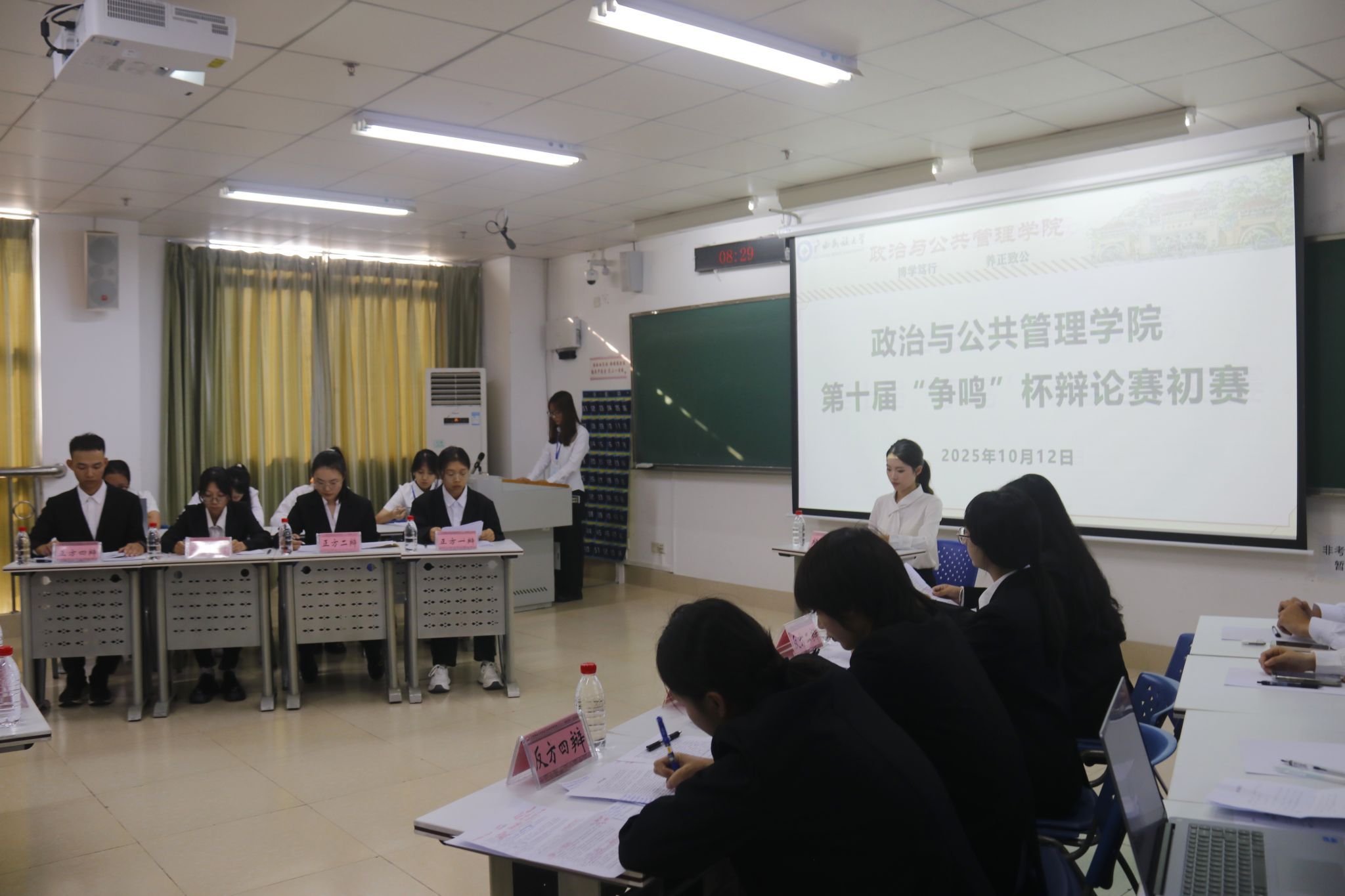 10月12日上午,政治与公共管理学院第十届“争鸣杯”辩论赛初赛拉开序幕,初赛共分四场,参赛队伍由8支2025级新生班级队伍组成。